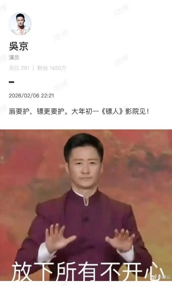而真正让吴京坐稳春节档顶流位置的,还是他主演的武侠电影《镖人》。作为改编自同名爆款漫画的作品,电影从筹备起就备受关注,上映后更是凭借硬核的动作场面和紧凑的剧情口碑票房双丰收。有观众看完感慨“终于有不谈恋爱的武侠片了,全程打戏拳拳到肉”,还有人被电影里的江湖情义打动,表示“哭着走出影院,这才是中国人的侠客精神”。三天破10亿的票房成绩,不仅创下了吴京个人主演电影的最快破10亿纪录,也让他成为继沈腾之后,第二位主演电影总票房突破300亿的演员。从《战狼》系列的铁血军人,到《流浪地球》的硬核工程师,再到《镖人》里的江湖镖客,吴京这些年用一个个深入人心的角色证明,真正的硬汉从不需要靠“糙汉”人设博眼球。就像这次涂唇膏事件,他没有回避也没有卖惨,反而用幽默坦然的态度打破了大众对“硬汉”的刻板印象——原来铁汉柔情不是说说而已,懂得爱护自己的男人才更有魅力。如今《镖人》的票房还在持续攀升,不知道这个既会护唇又能打戏的吴京,还会给我们带来多少惊喜呢?